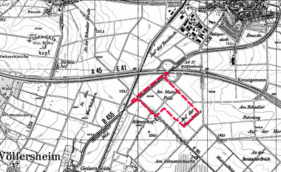Das für das REWE-Logistikzentrum vorgesehene Gebiet befindet sich an der B 455 zwischen Wölfersheim und Berstadt.
