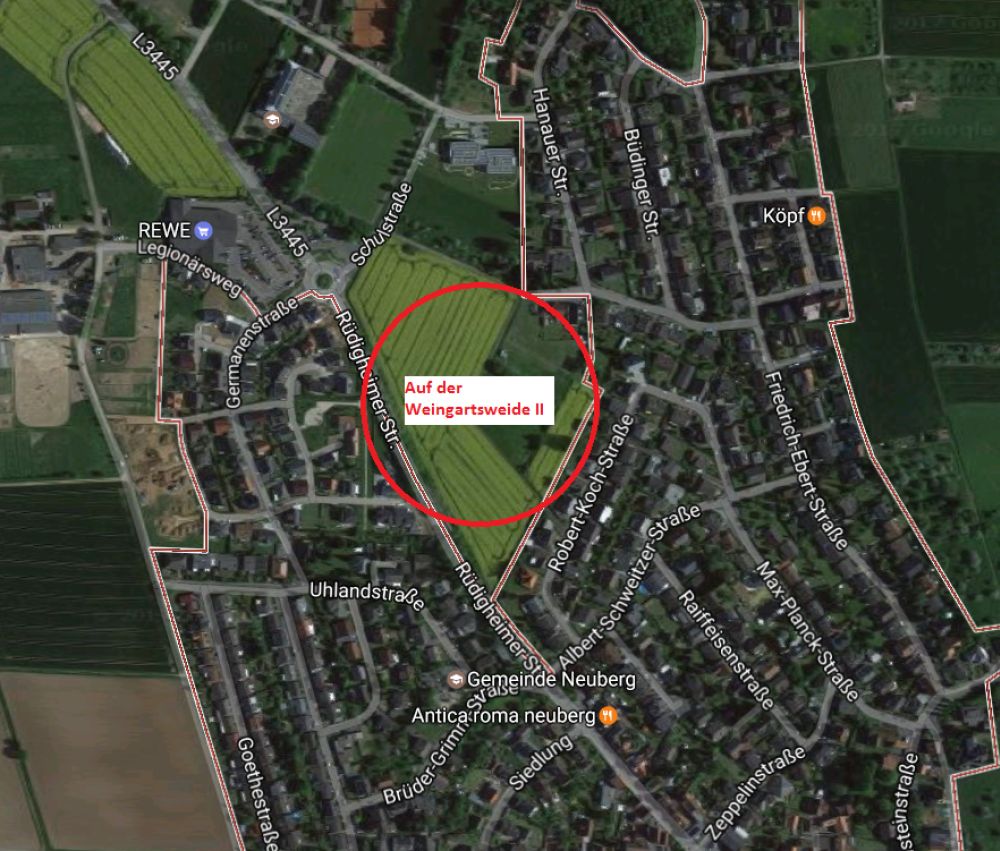 Das Wohnbaugebiet liegt im Neuberger Ortsteil Ravolzhausen zwischen alter Bebauung und der Erich-Simdorn-Schule.